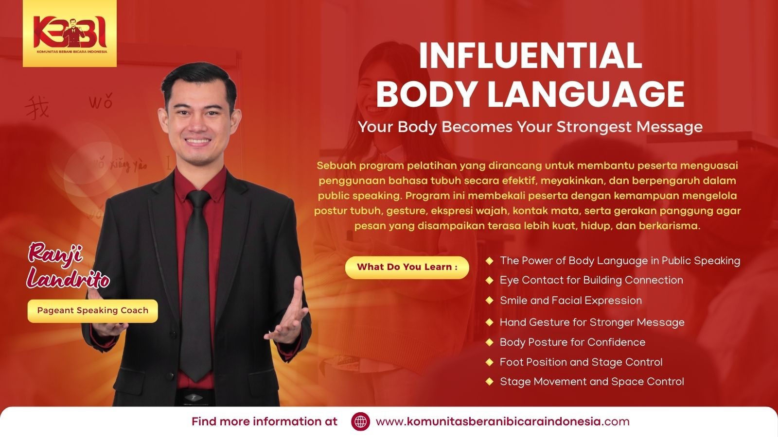 Ranji Landrito adalah salah satu Alumni saya di Sekolah Trainer dan Motivator Indonesia. Anak muda yang penuh semangat dalam belajar. Dan melalui keterampilannya sebagai seorang Public Speaker akan lebih mudah membantu anak muda lainnya agar memiliki Value yang sama dengannya.